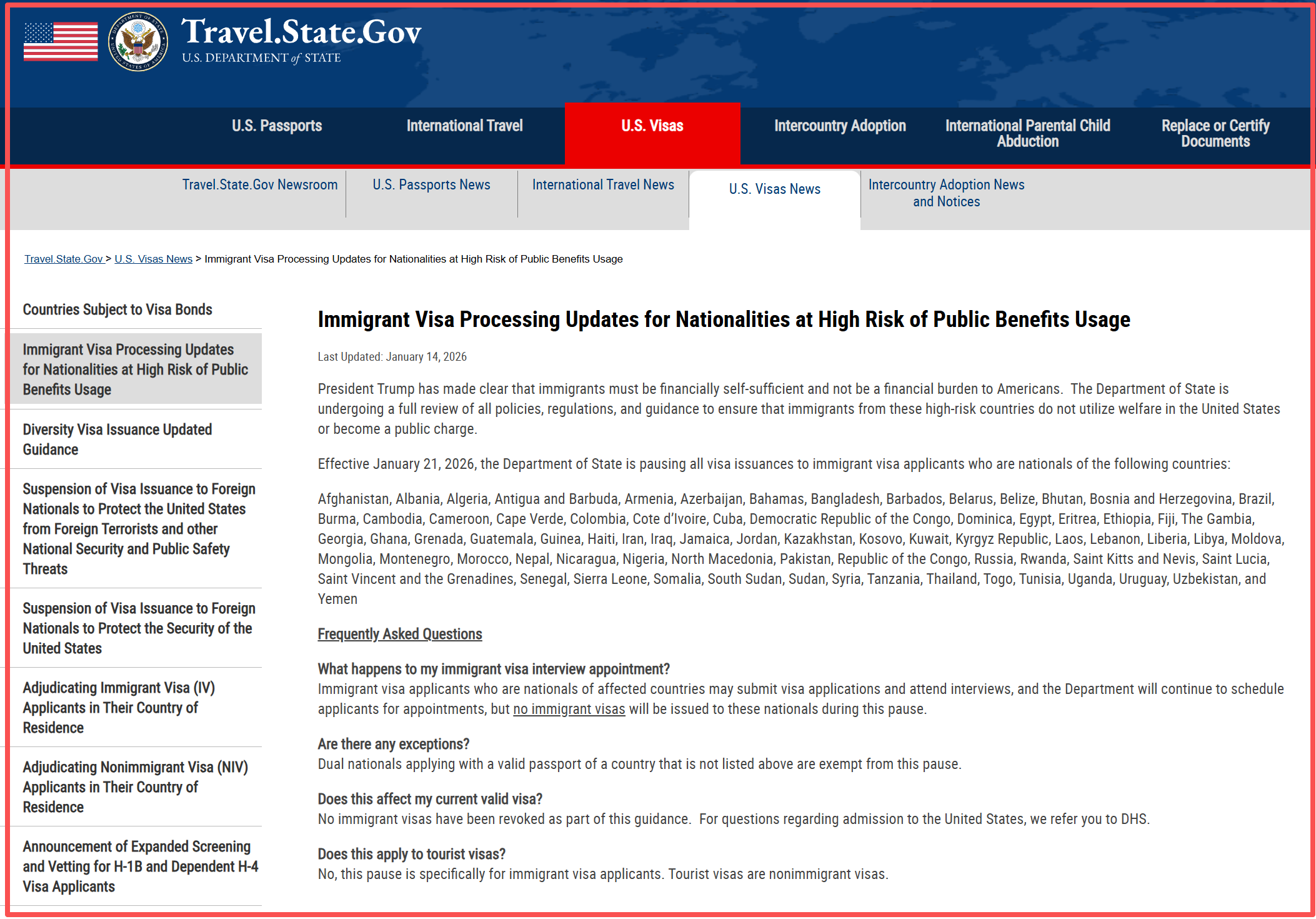 将从2026年1月21日起,无限期暂停针对75个国家的“移民签证(Immigrant Visas)”办理。