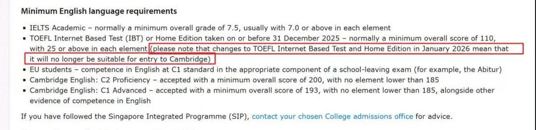 近日,剑桥大学于官方本科申请更新了语言要求,明确宣布从2026年1月起不再接受新版托福考试成绩。这意味着如果你计划用托福成绩申请剑桥,必须在2025年12月31日前完成考试并取得成绩,否则将无法用于申请。
